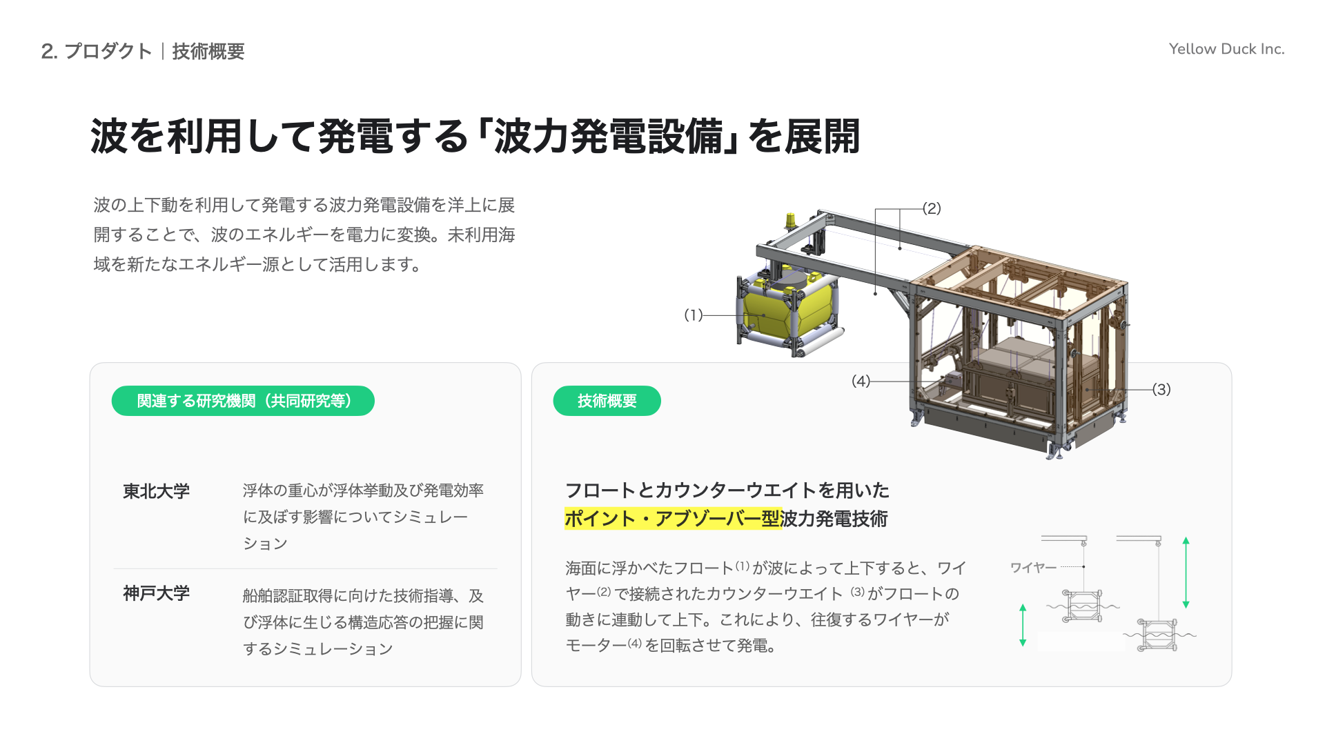 Yellow Duck株式会社(本社:兵庫県神戸市、代表取締役:中山 繁生、以下「イエローダック」)は、早稲田大学にて開催された早稲田大学アンビエントロニクス研究所及びエネルギーハーベスティングコンソーシアムによる合同シンポジウムに登壇・出展し、波力発電の可能性と課題について講演しました。