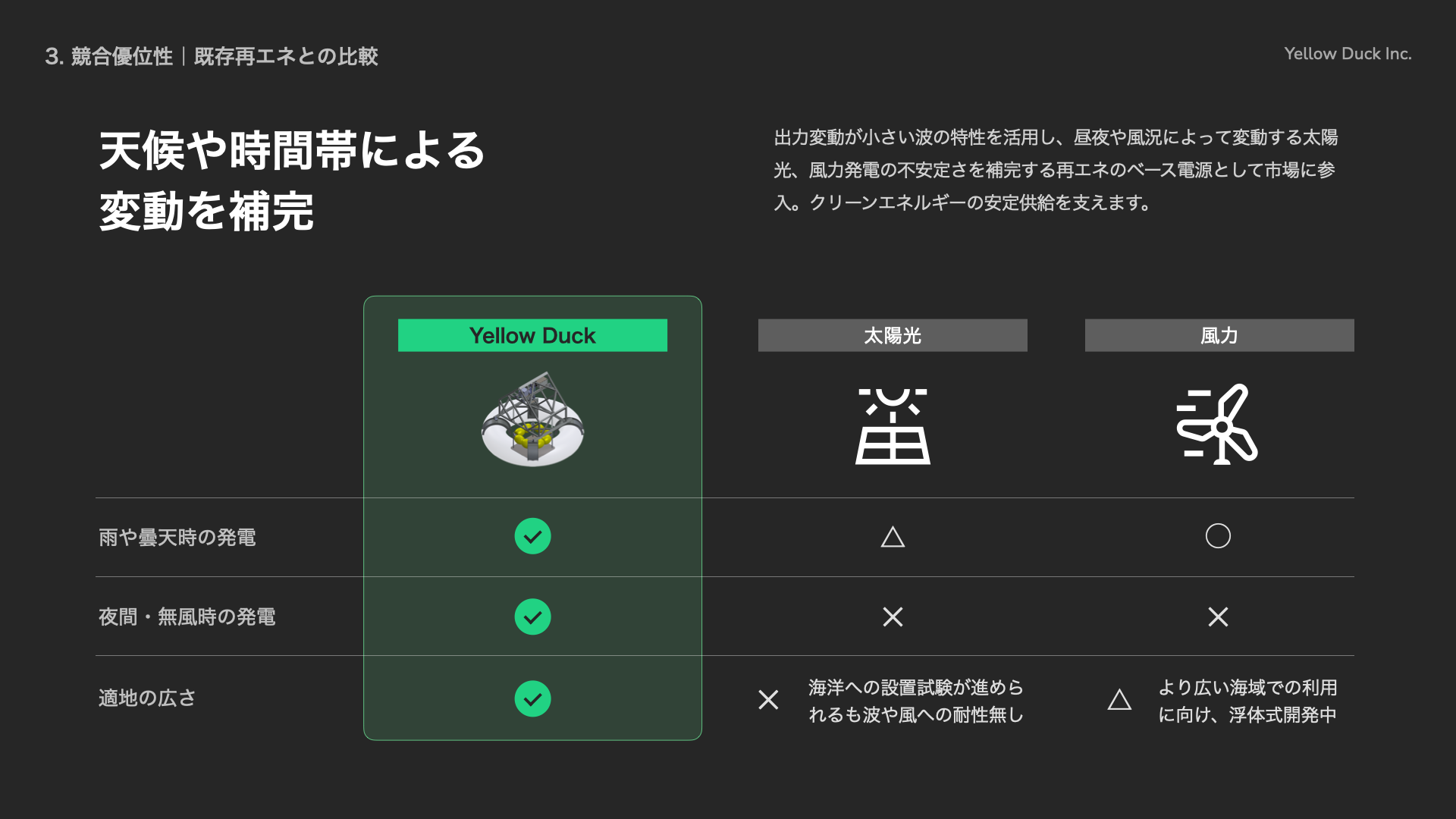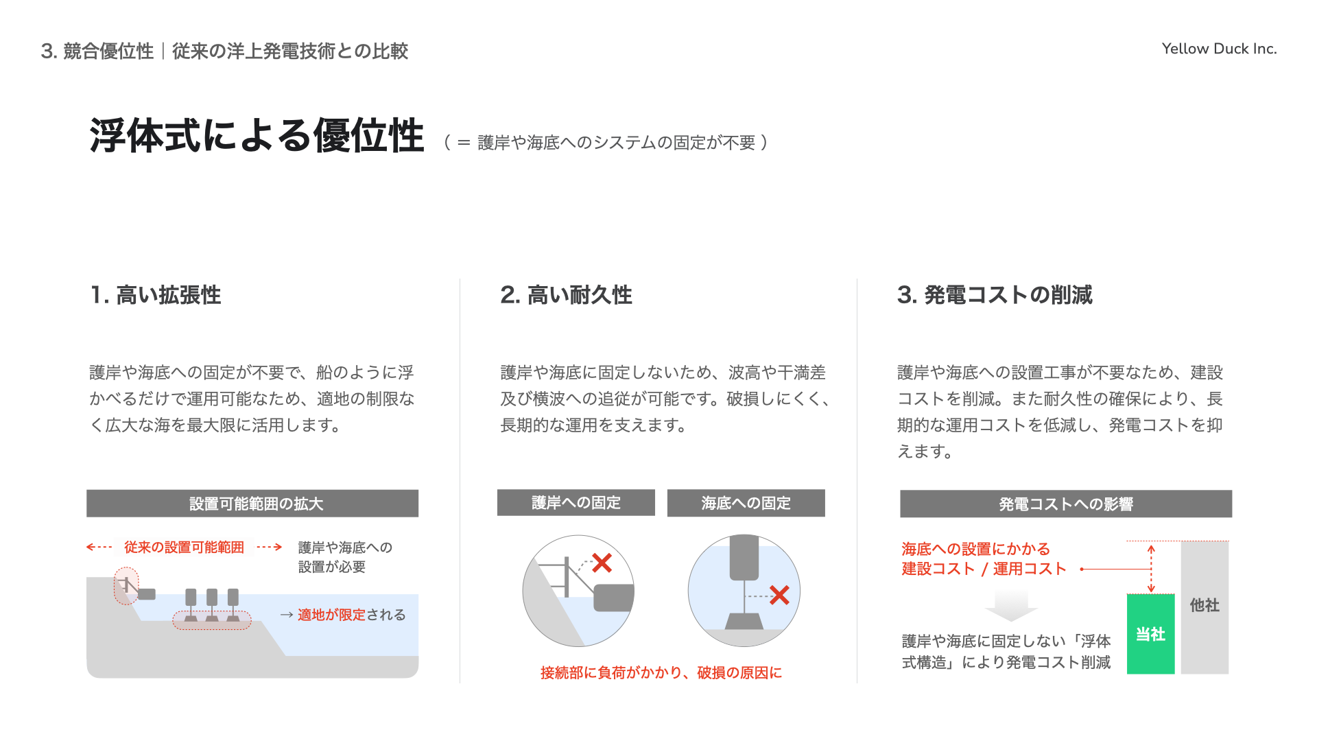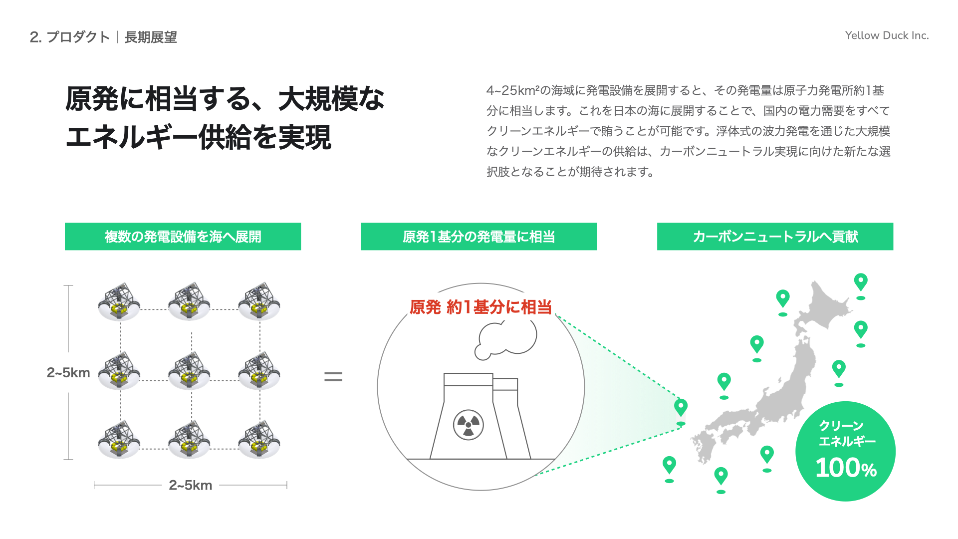 Yellow Duck株式会社(本社:兵庫県神戸市、代表取締役:中山 繁生、以下「イエローダック」)は、Plug and Play Japan株式会社(本社:東京都渋谷区、代表取締役社長:ヴィンセント・フィリップ、以下「Plug and Play Japan」)が主催するイベントに登壇し、フランス電力(本社:フランス パリ、代表取締役:ジーン・ベルナール・レヴィ、以下「EDF」)との意見交換を実施しました。本イベントは、Plug and Play Japan 渋谷オフィスにて開催されたクローズドイベントで、会場にはフランス最大の電力会社であるEDF(Électricité de France)が来日しました。EDFはフランス唯一の原子力発電事業者であり、国内に56基ある原子力発電所の全てを所有・運転しています。 イエローダックは本イベントにて、海洋再生可能エネルギーの利活用に向けたソリューションについて紹介し、その可能性と展開における課題について同社と協議を行いました。